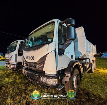 A Prefeitura de Campos de Júlio, por meio da Secretaria Municipal de Obras e Serviços Urbanos, adquiriu dois caminhões Iveco zero km, com recursos próprios, totalizando R$ 1.290.000,00. A aquisição foi realizada por adesão a uma ata de registro de preços, garantindo equipamentos modernos e eficientes para a manutenção urbana e execução de obras no município.