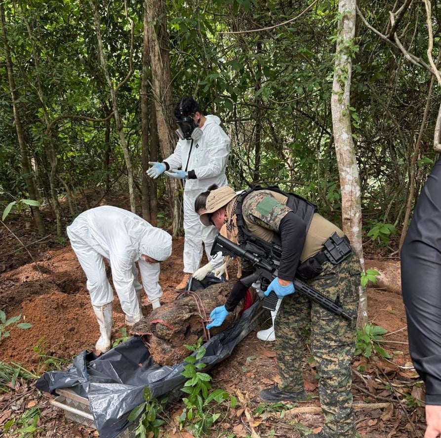 No ponto indicado, as equipes descobriram sinais de enterramentos clandestinos e localizaram dois corpos que ainda aguardam identificação.